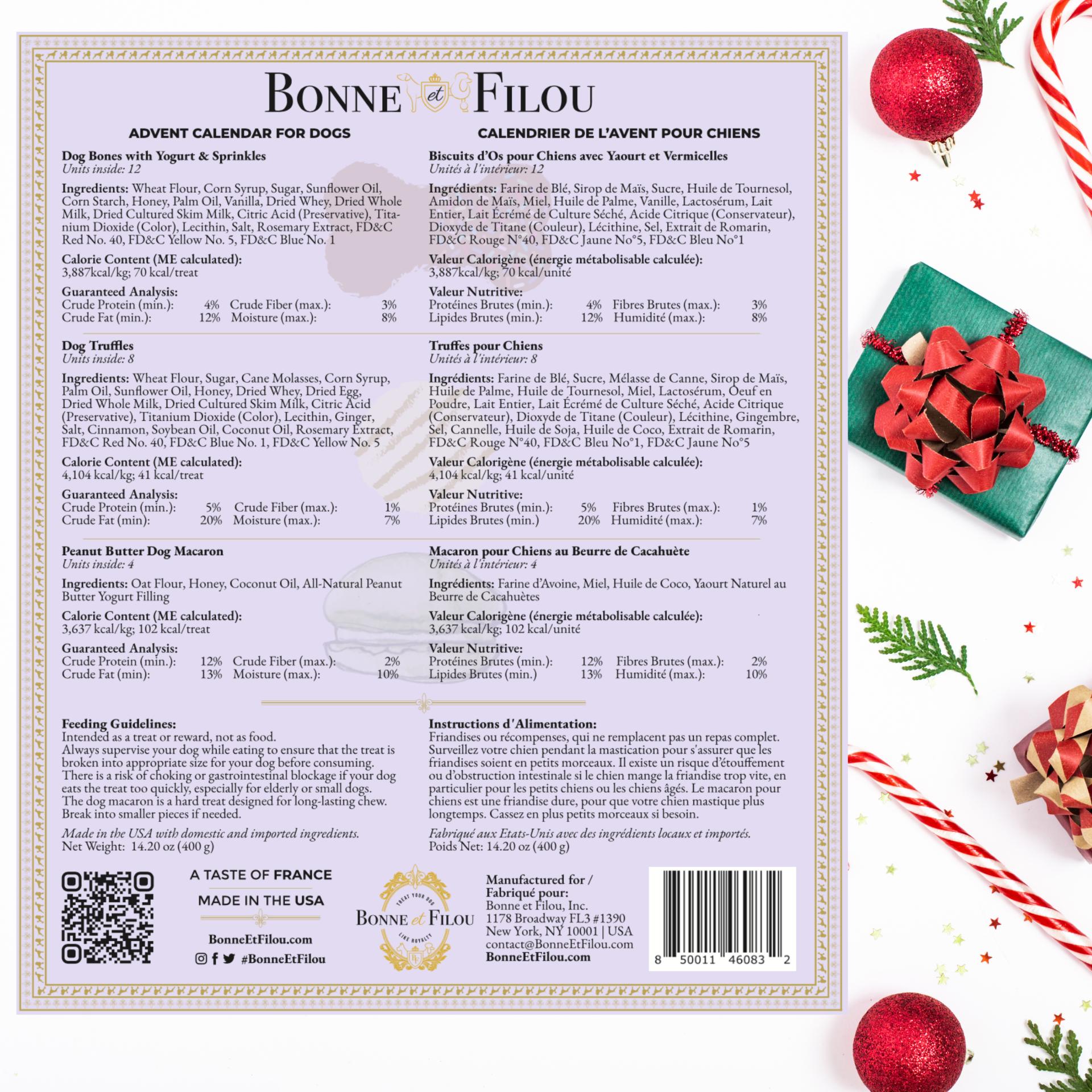 Treat your dog(s) with a delectable selection of handmade dog treats including dog truffles, dog bones and dog macarons. Open each window to find a special treat, while counting down to Christmas Day.
